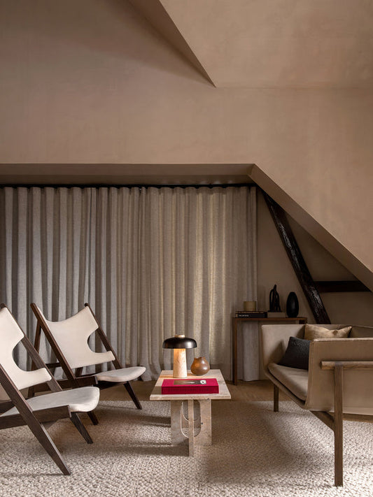 Jäger Lounge Table is an archival design from 1941. Mogens Lassen’s foldable table design is inspired by the folding stools and beds found in Tutankhamen's Egyptian tomb. Shaped from wood and detailed with brass fittings, the iconic Danish design table also features a brass plaque engraved with a unique serial number.