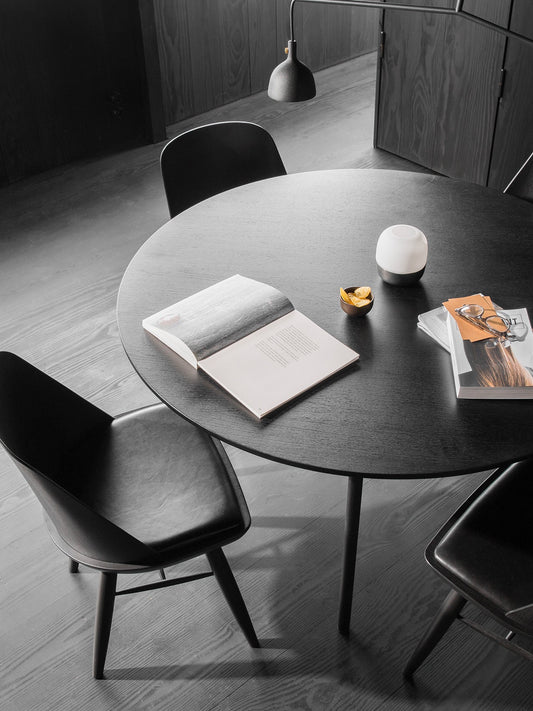 Modern dining rooms are given geometric appeal with the Snaregade Table. Visually light and sophisticated, it feels customized for every setting. The slim table comes in rectangular, oval or round tabletop versions – in linoleum, painted oak veneer or soap-treated solid oak – with a minimalist frame in powder-coated steel. A counter height table, bar table and conference table are also available.
