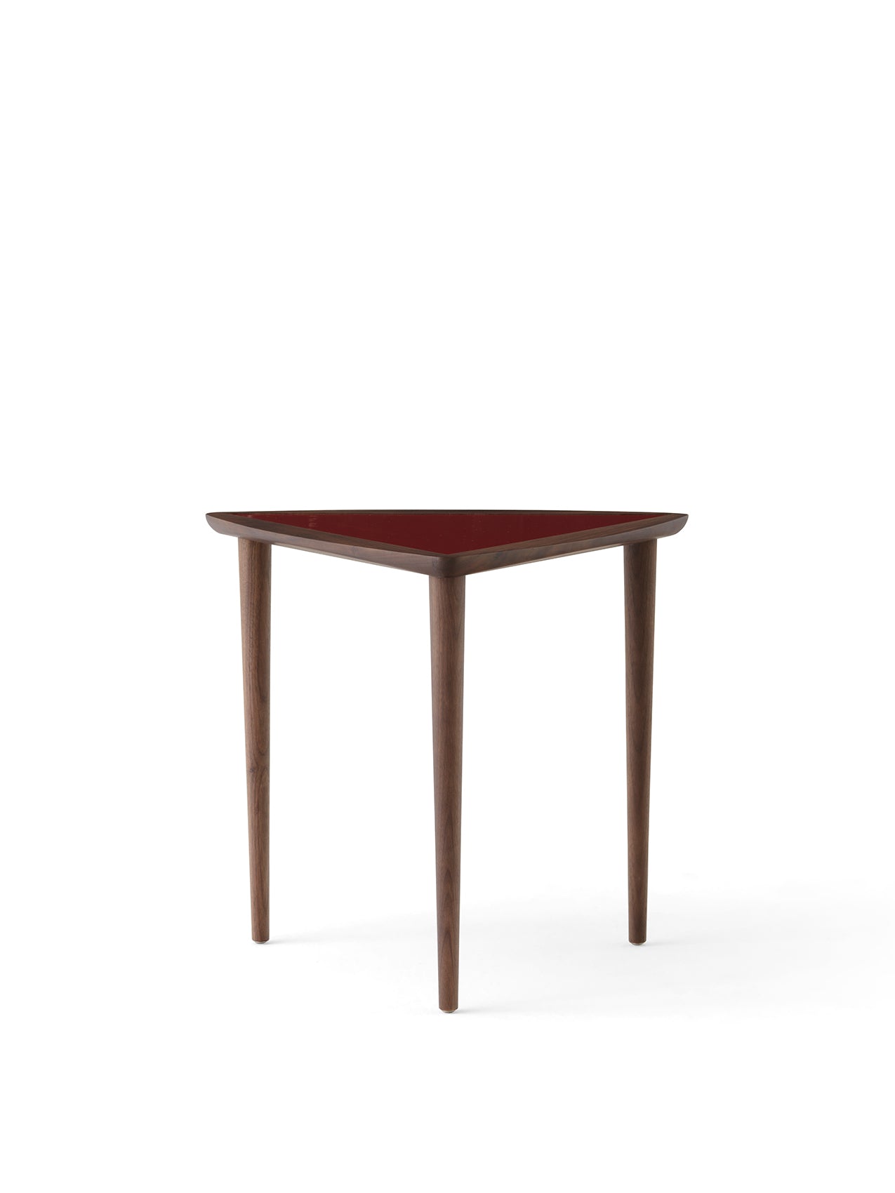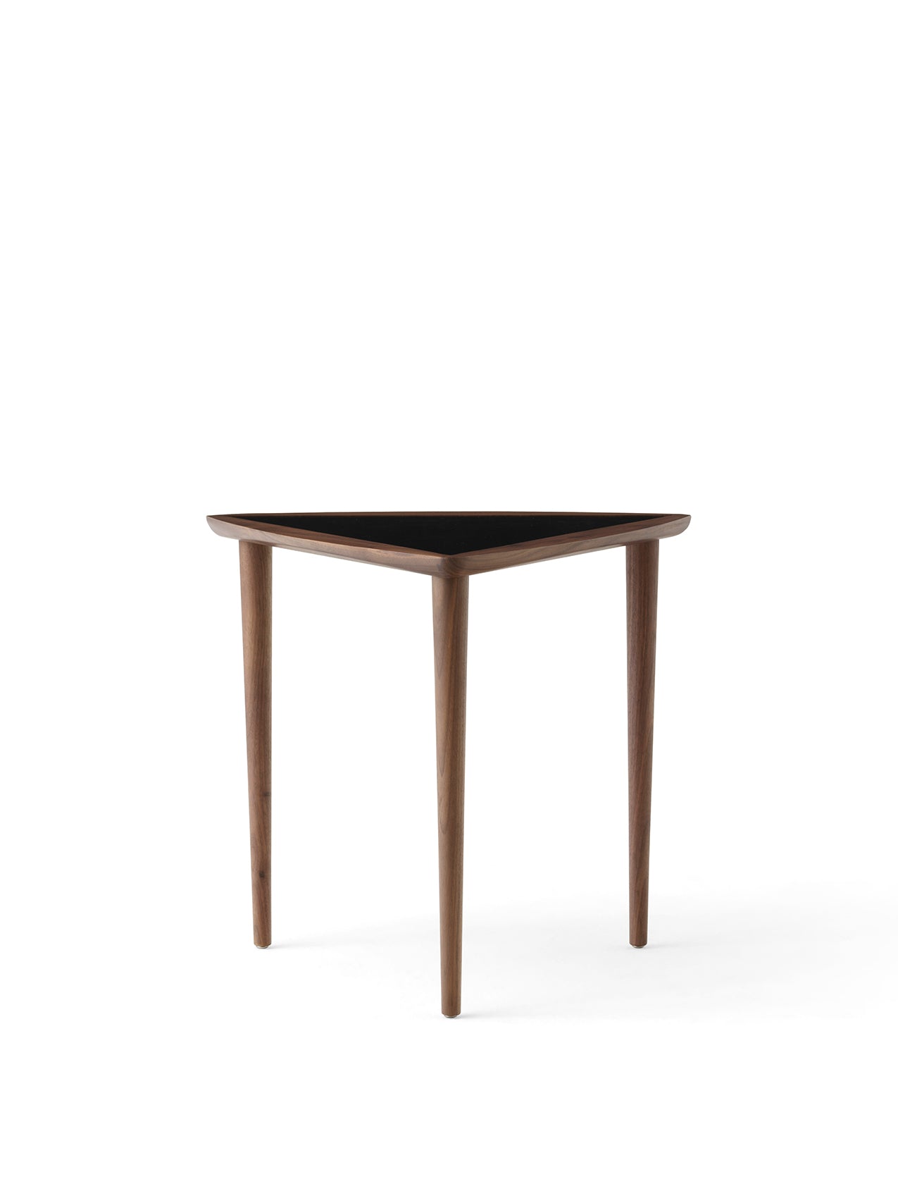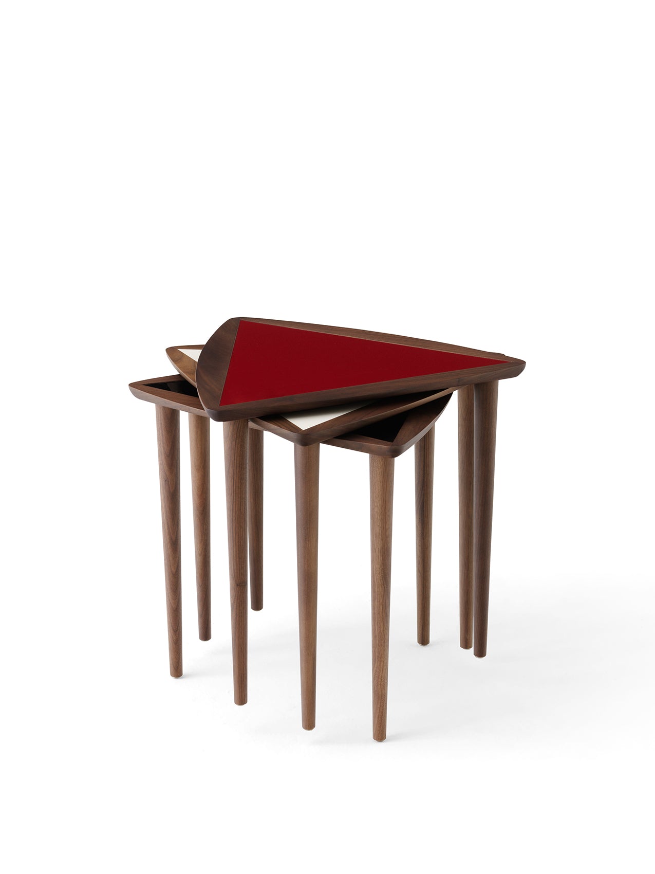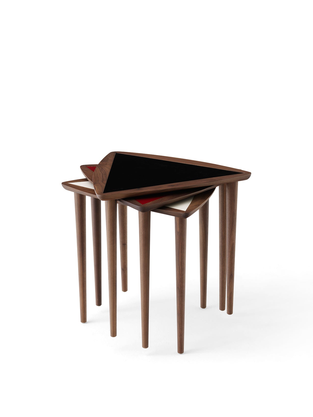 Designed by Arthur Umanoff during the 1950s, the Umanoff Nesting Side Table is a stackable, space-saving choice when room size is limited—and a beautiful piece of mid-century modern design. Colored laminated panels in geometric shapes add a decorative and practical note to the sleek, solid walnut design. Equal parts traditional and unconventional, the three tables accent a space whether placed together or used individually.