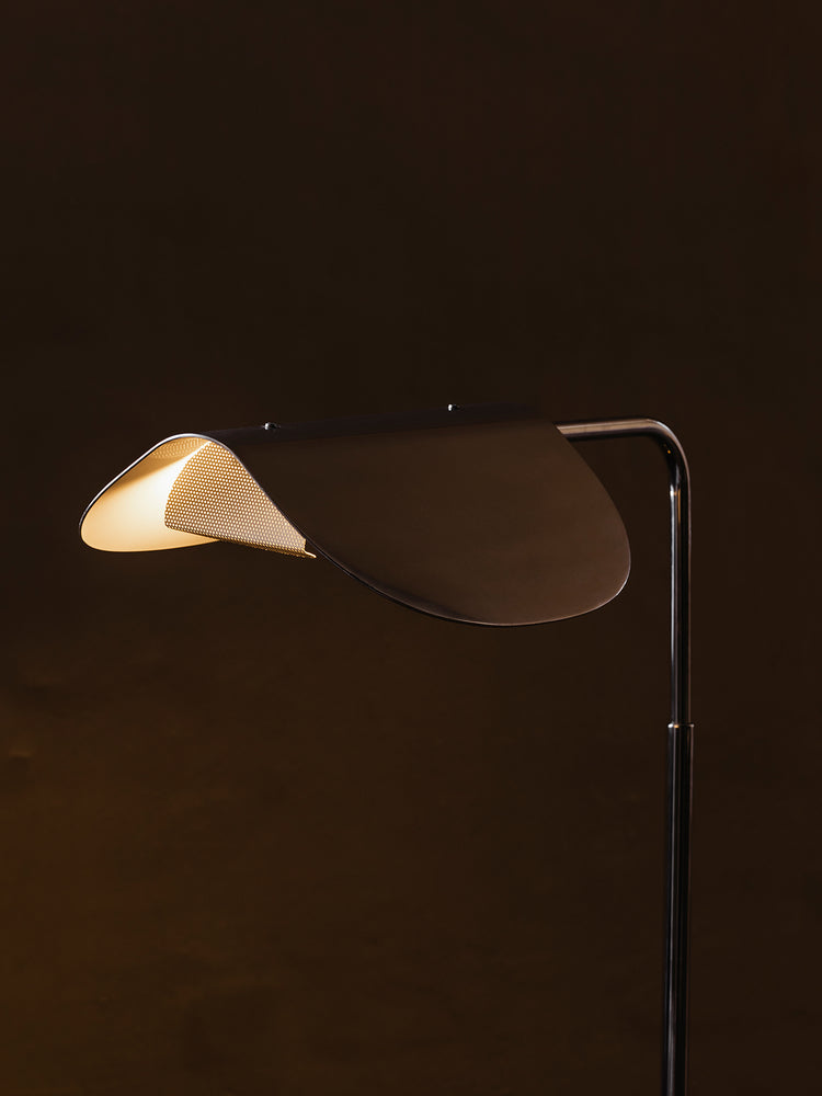 Modernist and minimal in form, the timeless task lights take their cues from nature: a folded aluminium shade resembles the wings of a bird in flight. The adjustable shade rotates, allowing the user to direct the light to exactly where it is required.