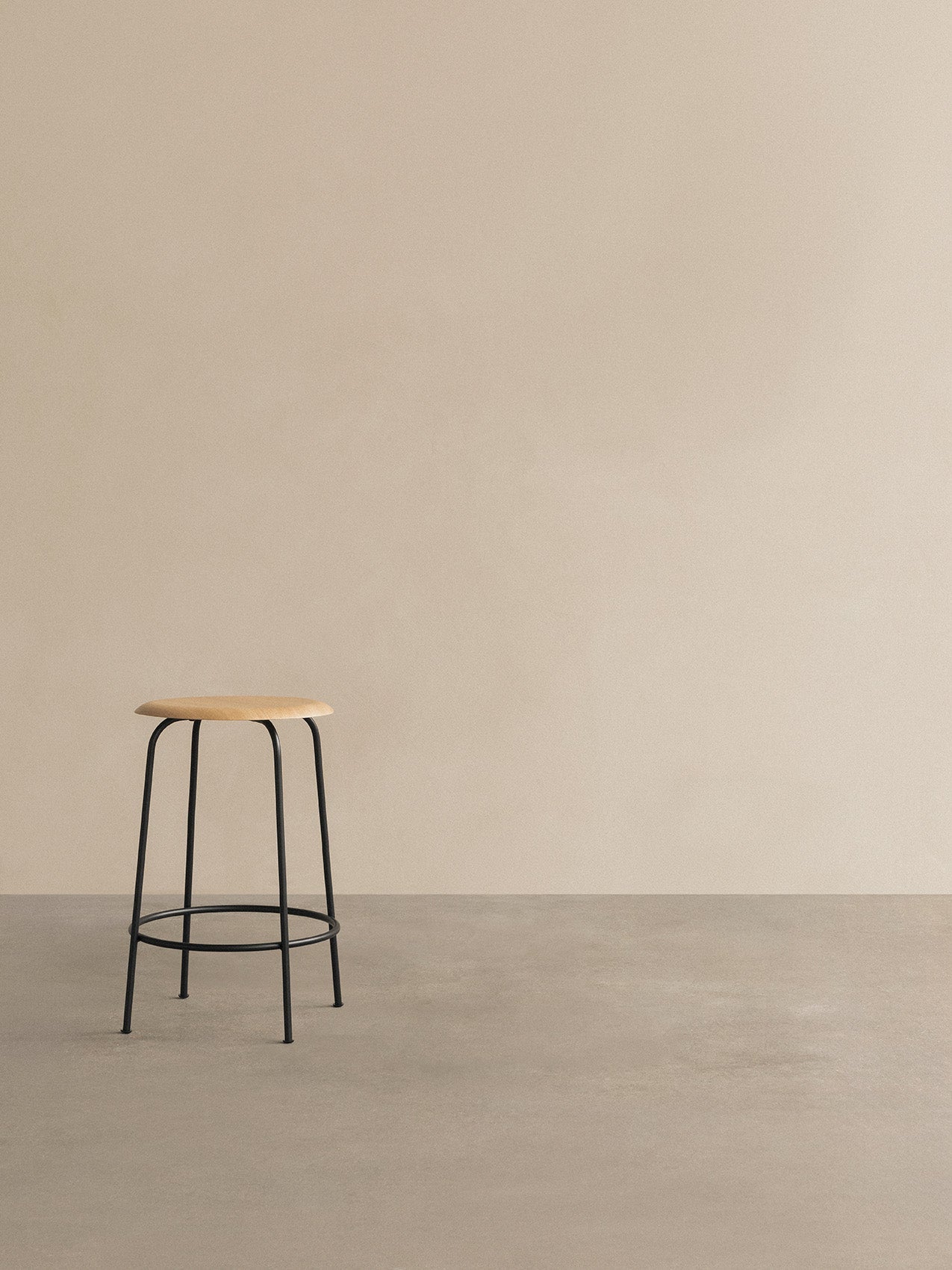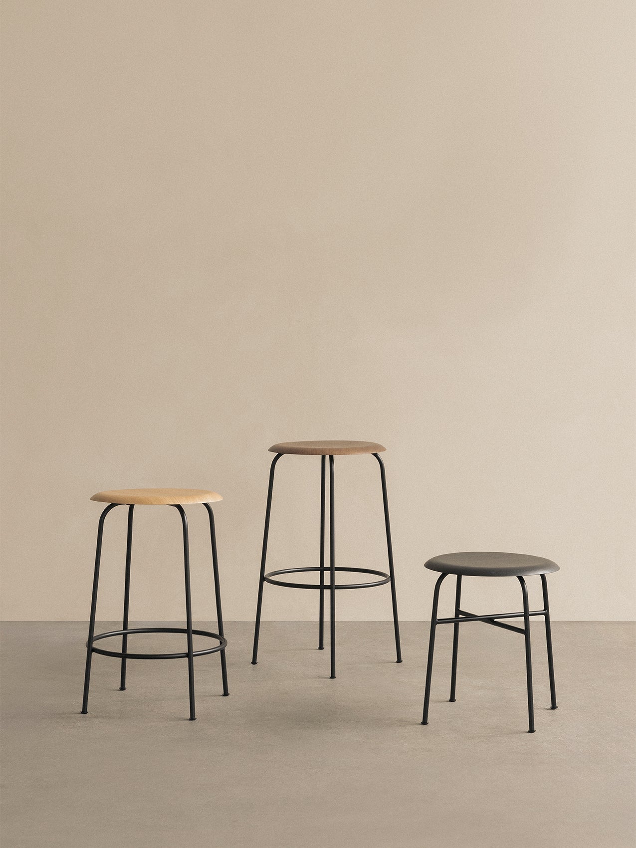 With its characteristic clean lines and sturdy base in tubular black powder-coated steel, tethered with cross bars for support, the Afteroom Stool comes in three heights, making it easy to slide up to a bar, counter or table. Boasting a high standard of craftsmanship and durability for long-lasting use, in wood veneer the stool brings warmth and tactility to interiors while its sleek, minimalist profile ensures it fits seamlessly into any setting.