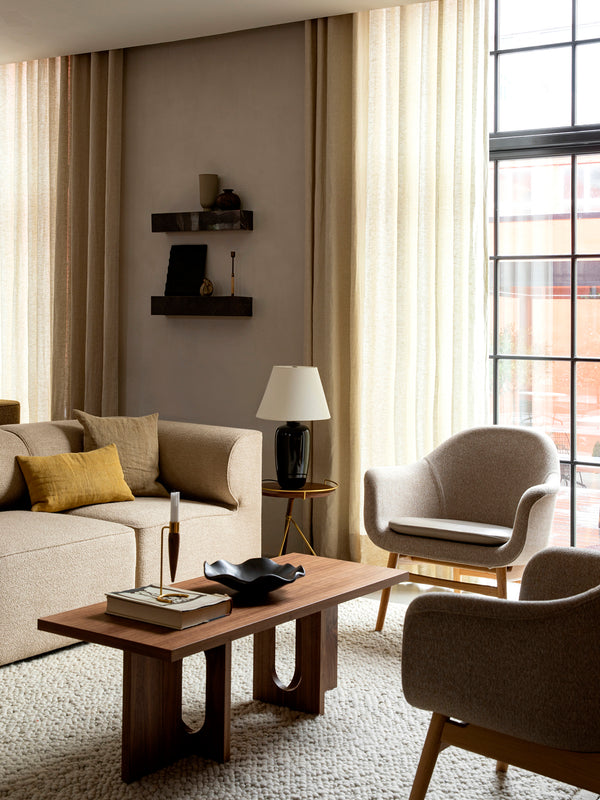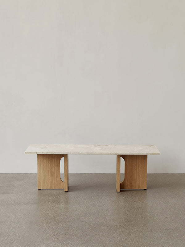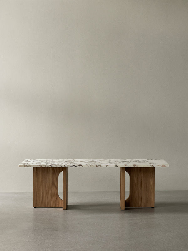 Originally developed by Norwegian architect and designer Danielle Siggerud as a modern and versatile table for Audo’s former showroom cafe? The Androgyne Collection profiles simple silhouettes and refined materials. Celebrating craftsmanship and wood, the Androgyne Lounge Table is versioned in natural or dark stained oak or walnut, as well as with the option of a kunis breccia stone or calacatta viola marble tabletop. With a shape and function made for everyday settings, the versatile, modernist design makes it possible to use as both a lounge table or bench for piles of books or statement decorations.