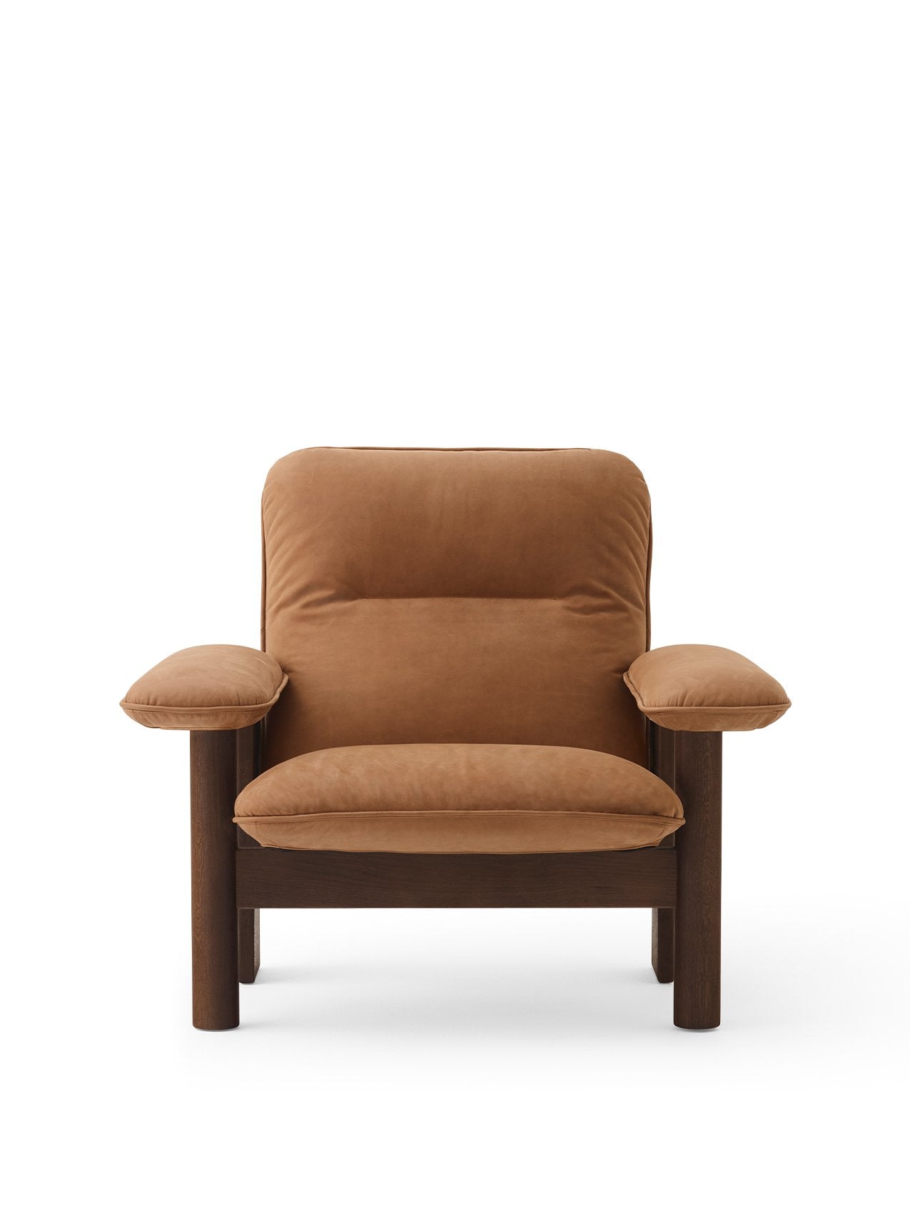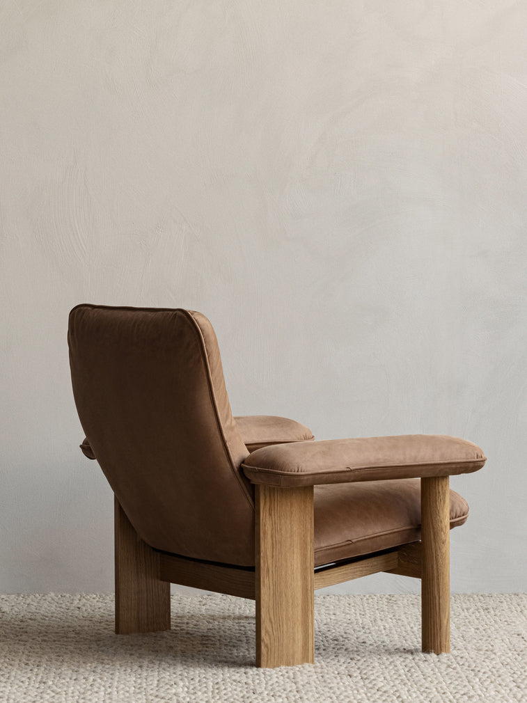 Scandinavian mid-century design aesthetics and Brazilian Modernism meet on the low-lying Brasilia Lounge Chair, designed for Audo by Anderssen & Voll. The luxurious armchair-lounge chair hybrid offers unparalleled sitting comfort thanks to its robust frame and soft upholstery. Characterized by its stout and sturdy legs, made using traditional joinery techniques, and exaggerated armrests and cushioning seat and backrest, upholstered in a range of soft fabrics, it creates a sense of comfort and ease in any setting.