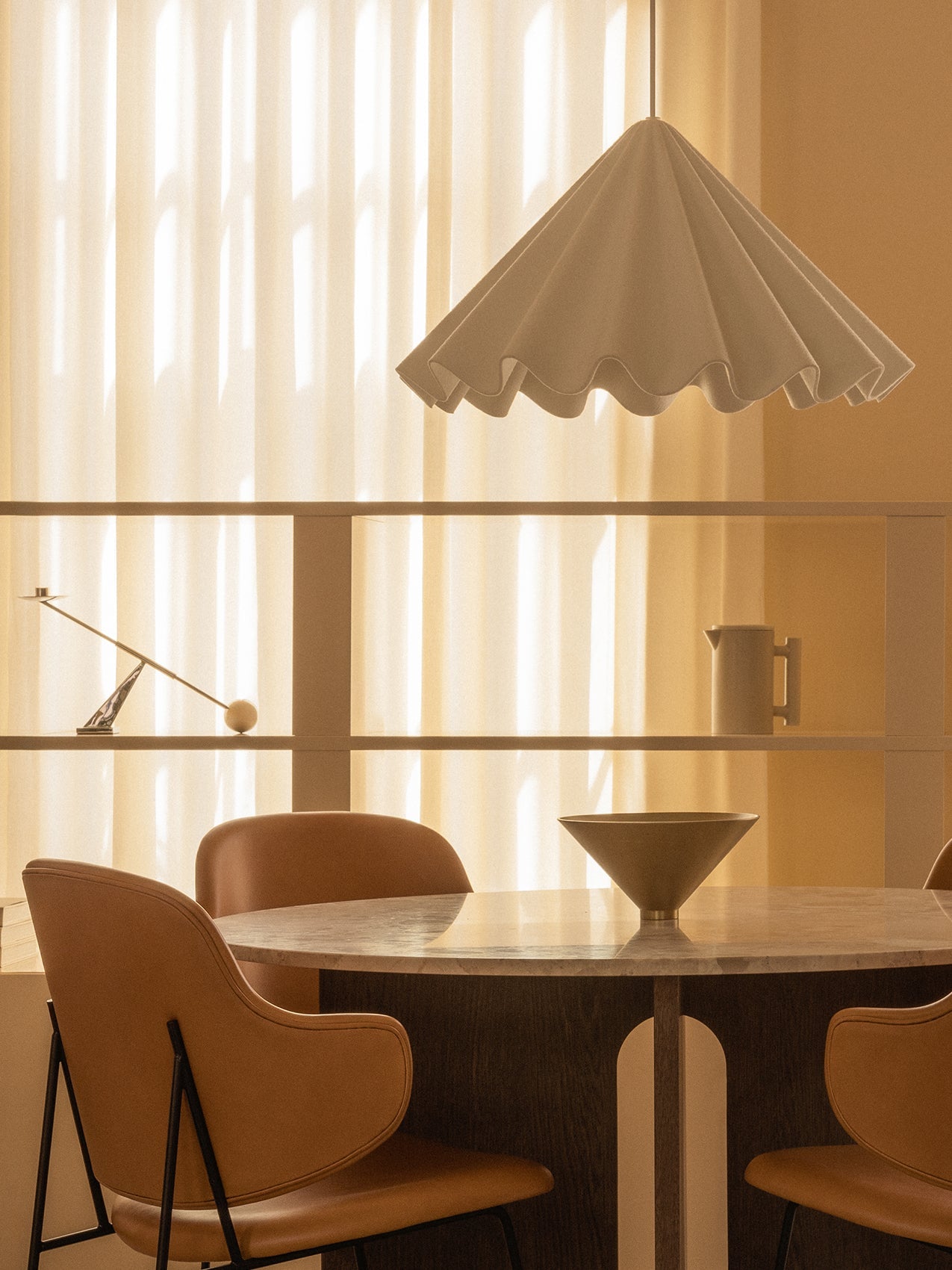 Design is an art of storytelling according to the Copenhagen-based duo Iskos-Berlin, and their Dancing Pendant for Audo Copenhagen puts that principle into practice. Exquisite, yet with a playful twist, the expressive statement lamp takes its design cues from a dancer’s pleated skirt caught flaring up mid-twirl — an idea that grows and finds its final form, precise and orderly yet soft and fluid. The sustainable lamp is crafted in tactile polyester felt, a recyclable material made from used plastic bottles.
