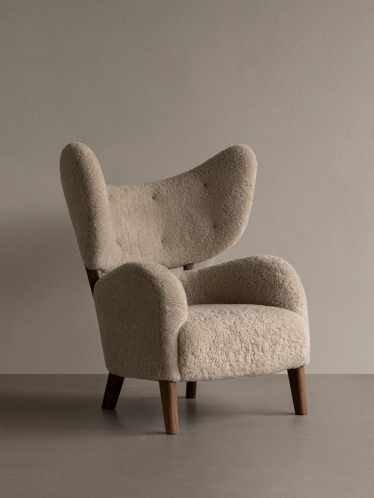Designed by Flemming Lassen in 1938, My Own Chair is an original and eye-catching piece of mid-century Danish modern design. Upon launch it received much praise for its sculptural form with distinctive wings, yet its complex two-part silhouette made it unsuitable for mass production until the advent of modern techniques. Its lumbar supportive, rounded, angled seat and extended backrest cocoon the sitter in comfort. Wooden legs and expert upholstery complete the design. A corresponding footrest adds to the sense of ease. Said to be Lassen’s favorite chair, it stood at the designer’s home until his death in 1984.