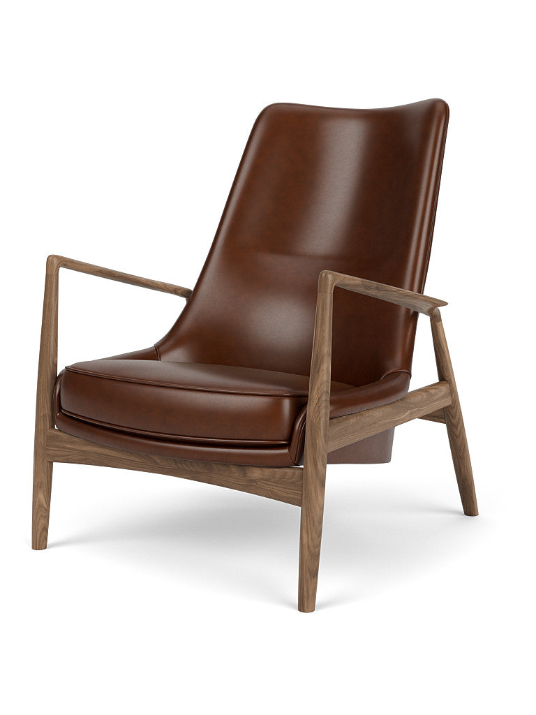 Arguably one of Ib Kofod-Larsen's best-known designs, The Seal is an elegant armchair typical of its time – and yet entirely timeless. The angled frame and armrests and leather upholstery put comfort at the fore, inviting lounging. And despite being made of heavy materials, it has a lightness to it; the shell appears to float inside the wooden frame. Named after the Swedish ski resort, The Seal is a fine example of Ib Kofod-Larsen's organic design and focus on detail and comfort. The chair is available with a low or high back.