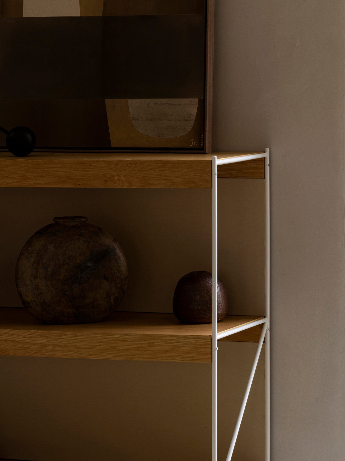 Put your objects in the spotlight with Zet, a modular shelving system that delivers on freedom and function. Easily assembled or disassembled and relocated whenever you want, its delicate balance of order, convenience and style is shaped from materials selected for beauty and endurance. Based on just two components - wooden U-shaped shelves and a metal frame construction defined by diagonal Z-struts – it comes in six colors and with optional display shelves and back panels.